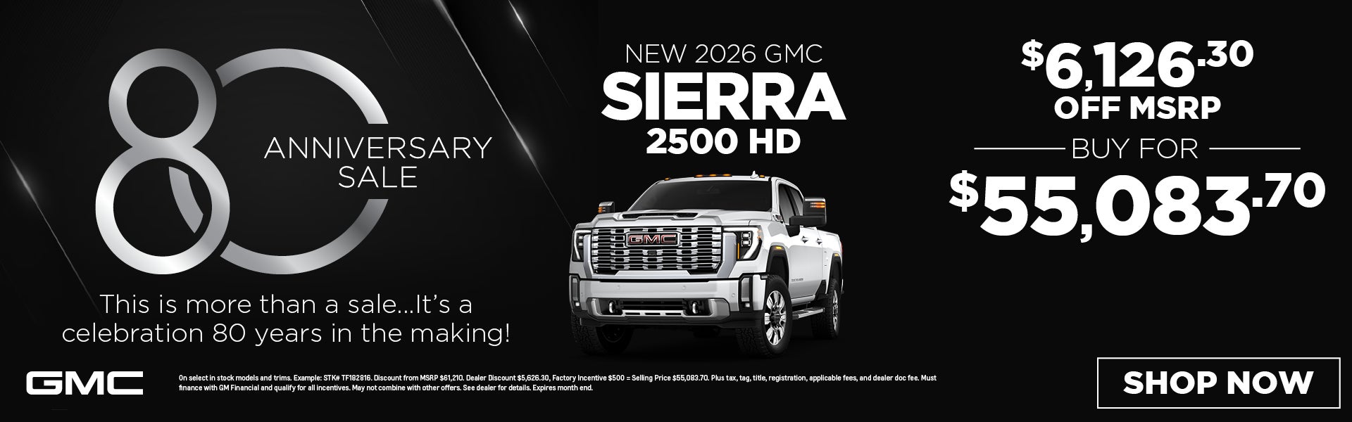 On select in stock models and trims. Example: STK# TF182816. Discount from MSRP $61,210. Dealer Discount $5,626.30, Factory Incentive $500 = Selling Price $55,083.70. Plus tax, tag, title, registration, applicable fees, and dealer doc fee. Must finance with GM Financial and qualify for all incentives. May not combine with other offers. See dealer for details. Expires 3/31/26.
